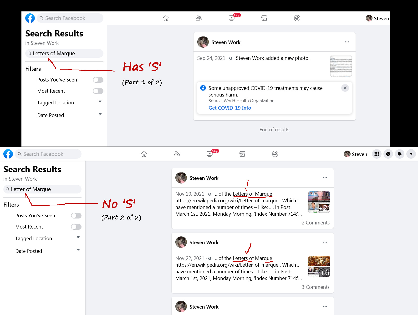 Strange .. I had a Problem using Facebook Search, looking in my Posts for 'Letters of Marque', exact matches exist but only showed up when I Searched under 'Letter of Marque'.