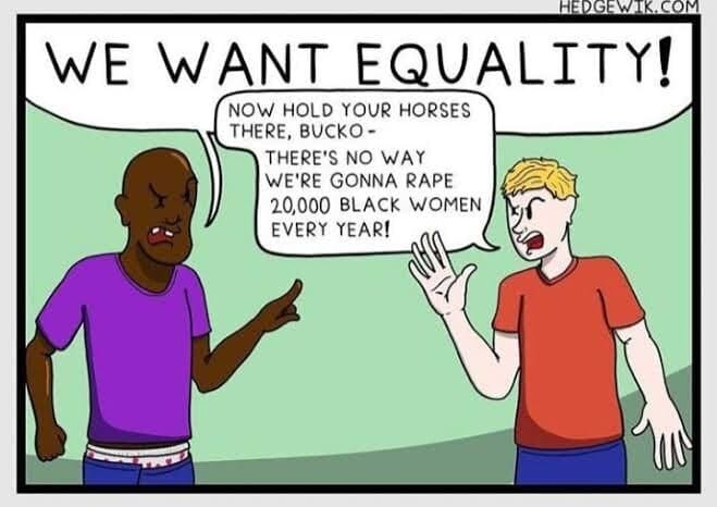 A funny - and perhaps offensive – Cartoon about race 'equality' requiring white men to start raping at least an extra 20,000 black women - reminder of how all families are threaten by fatherless young men, included in Images below.