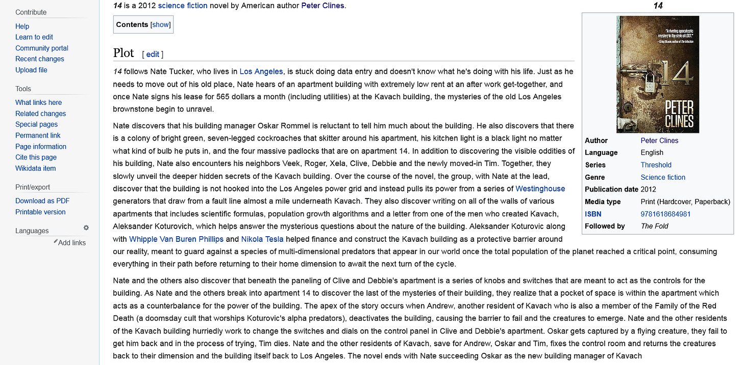 .. one of Threshold[8] series, the first being '14' (named for a mysterious apartment number in an apartment building),..