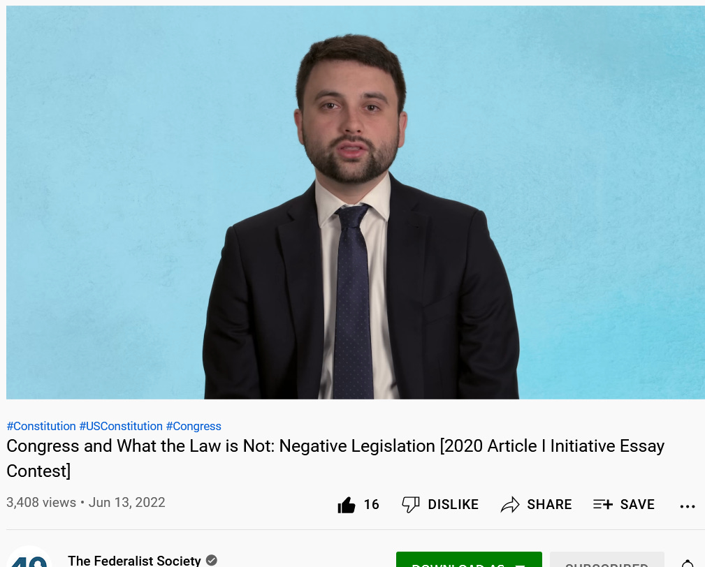 DropBox: https://www.dropbox.com/s/h2dyom9q60zwtoa/Congress%20and%20What%20the%20Law%20is%20Not%20Negative%20Legislation%20%5B2020%20Article%20I%20Initiative%20Essay%20Contest%5D.mp4