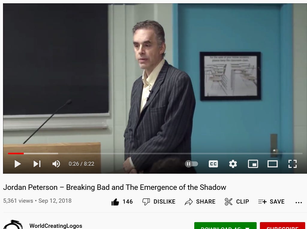 First is a long video – I suggest you read the comments around it and watch later, but move to the following two – first is a shorter clip of lecture video Peterson talking about the physiological concept of the 'Shadow' and the Character [Prof. W. White] in Series 'Breaking Bad' related to Nazis and ourselves, and Spetznaz's focusing on the Character Prof. White .. such amazing writing!