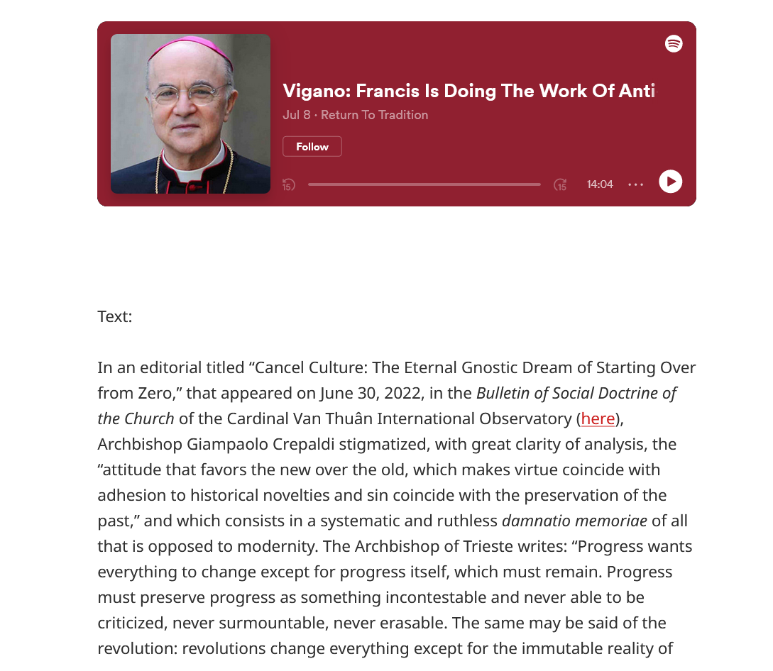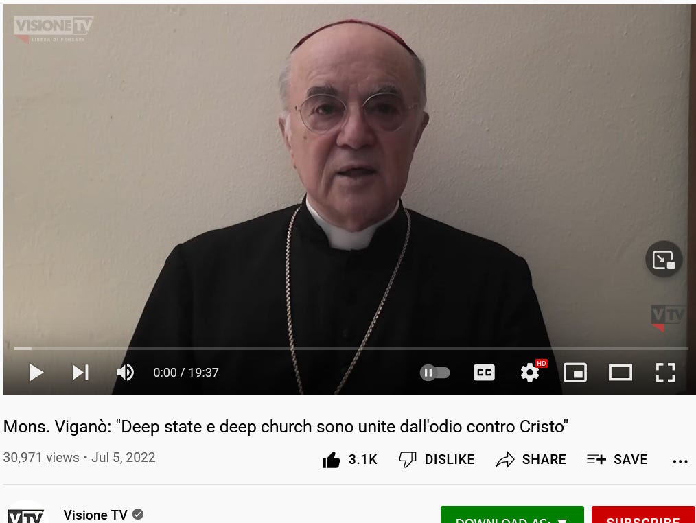 “Mons. Viganò: "Deep state e deep church sono unite dall'odio contro Cristo"”