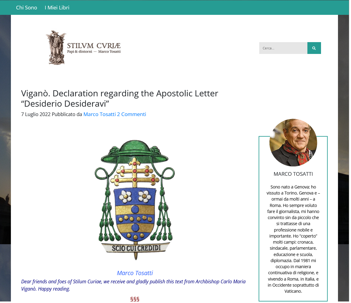 “Viganò. Declaration regarding the Apostolic Letter “Desiderio Desideravi””