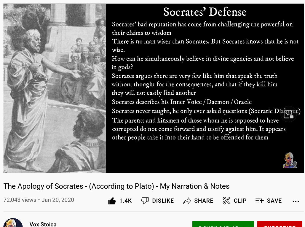 Here is a better version of Socrates Apology – complete with video notes about his points!