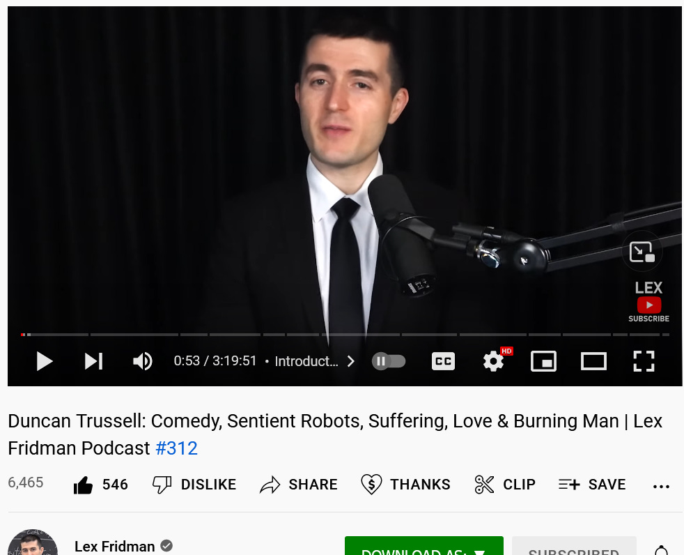 And of course Lex is fun to watch interviewing, the questions and his strange points & tangents are fun – or at least interesting. Not a one dimensional thinker, ..