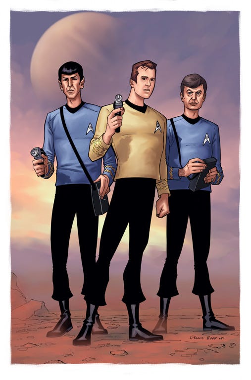 The 'away team' he would take to the new planets was always him, Spock (hyper-rational humanoid science focused alien - otherwise not much different to regular humans), and Doctor McCoy – the ship's doctor.