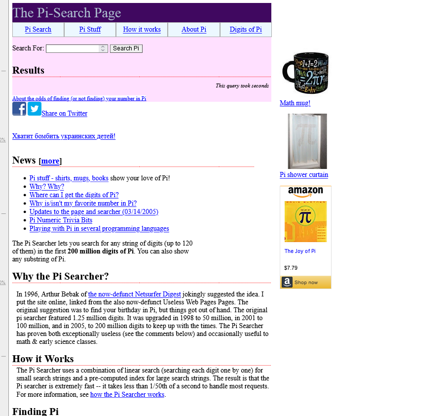.. my friend asked about the Searching of Pi digits – which is the exact question I asked myself – and when I went looking for a storage of huge lengths of calculated Pi [Profane] values to use a standard sequential search on some example that day I found – and talked about and later sent to him by email the web-site that does this, ..