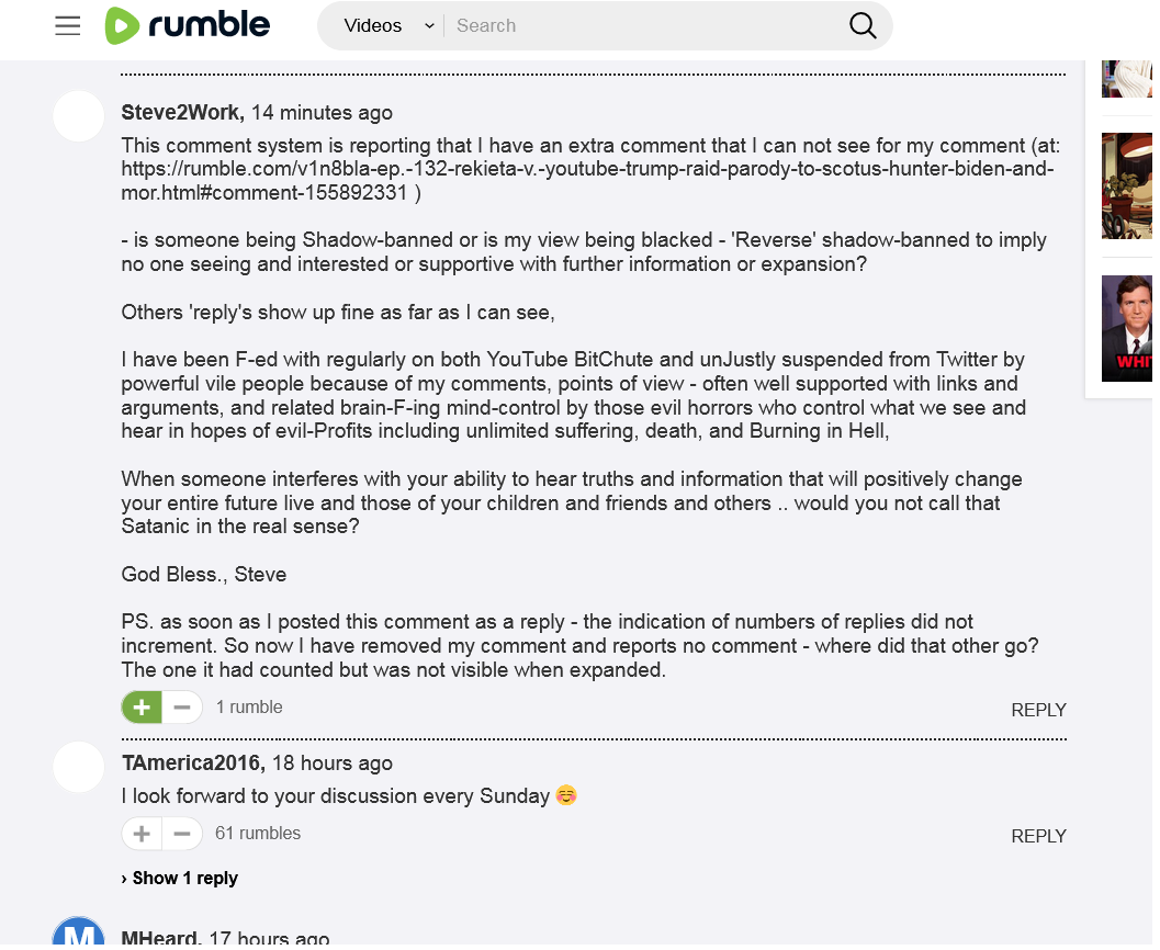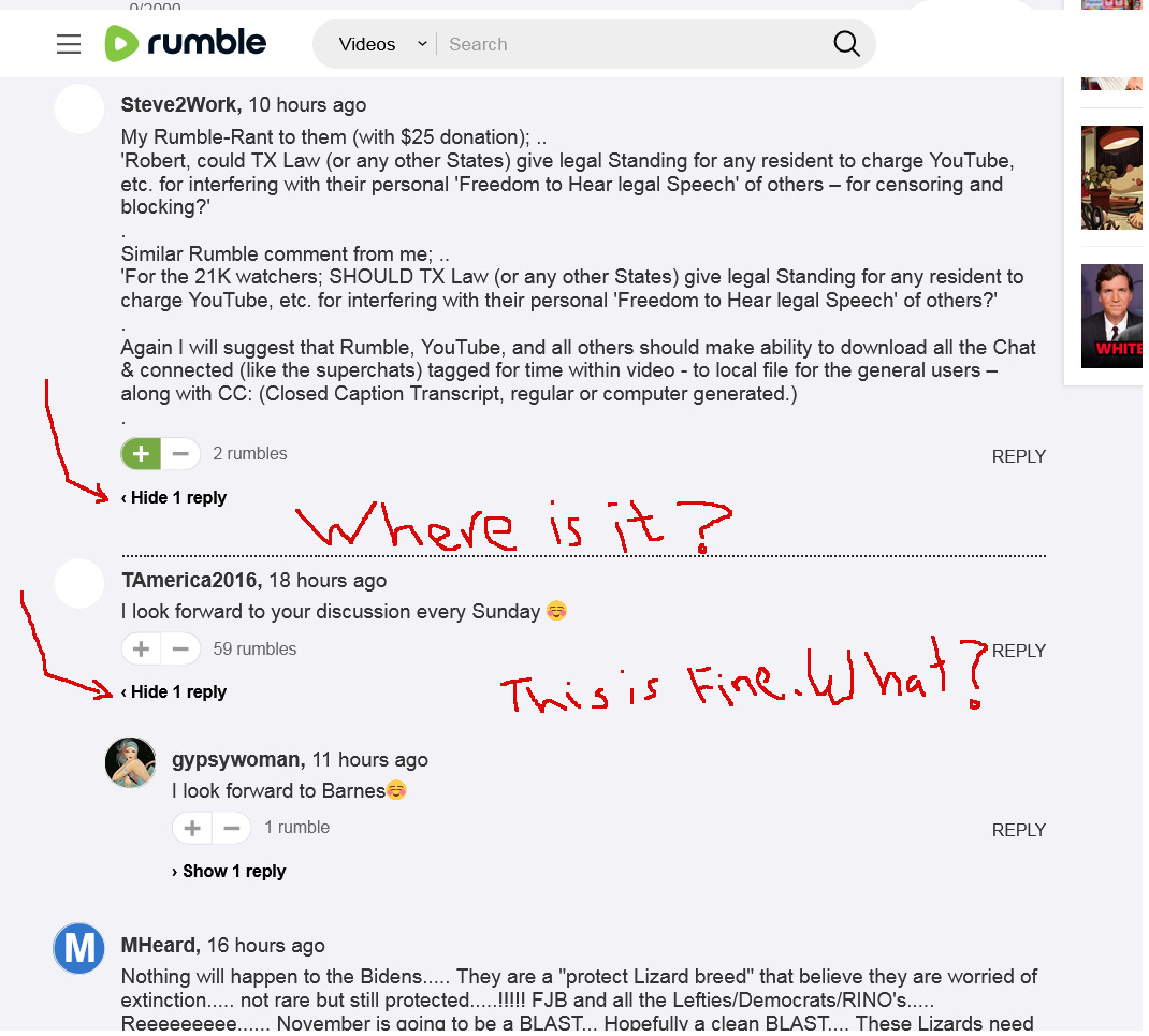A lot of good videos – the Lawyers Viva & Barnes' video had a lot of great subjects .. and that Texas Law related to be able to sue for censoring Legal [political] Speech was mentioned – which motivated me to sent a Note with donation to highlight it about including the reverse for Standing, that is to allow you or me if we live in a State with a law passed to sew YouTube, Twitter, Facebook, .. for blocking access to the Legal Speech of others – to start the process of recognizing that such is a crime against everyone and the future, that the slimy evil Witches are re-writing history - until soon the Jan 6th will be taught like the holocaust's 6 Billion Billions or whatever is the forced number it illegal in many places to even question – such evil to our grandchildren and children while we watch – helpless to hear peoples testimonies, and good information that might improve millions or billions of lives over time are suppressed because Satan wants us all Burning in Hell.