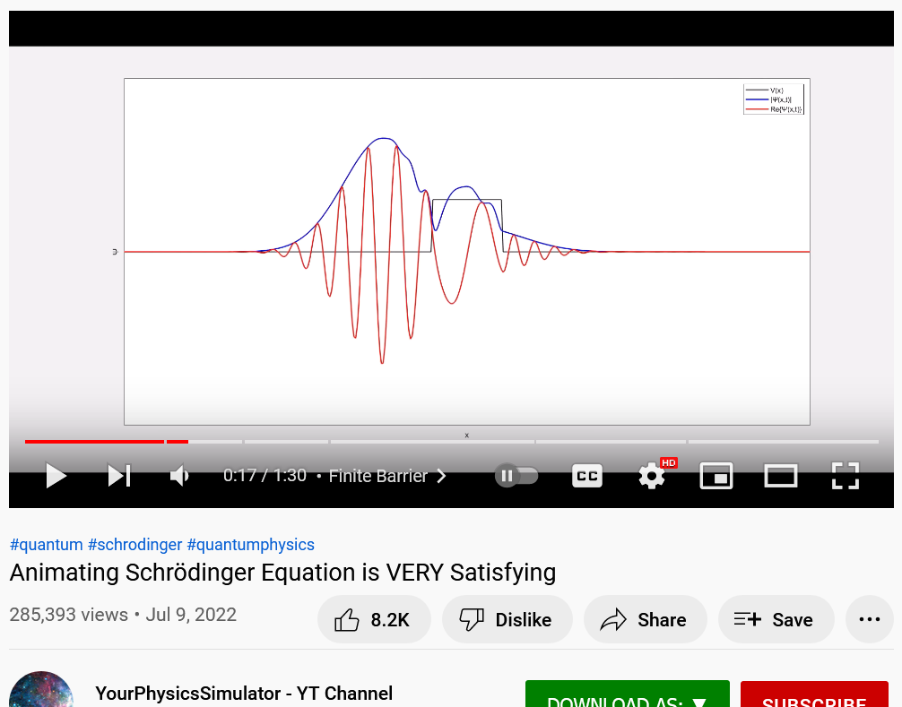 From Video description - 'A gaussian pulse traveling through space under a few examples of potentials. This is a simulation about the Wave Function in Quantum Mechanics! The wave function Ψ represents the whole information about the particle, and Ψ* Ψ represents the probability density.