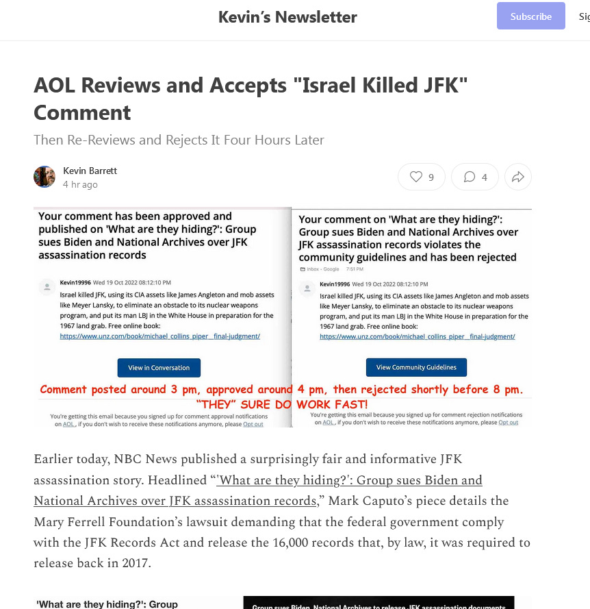 “AOL Reviews and Accepts "Israel Killed JFK" Comment”