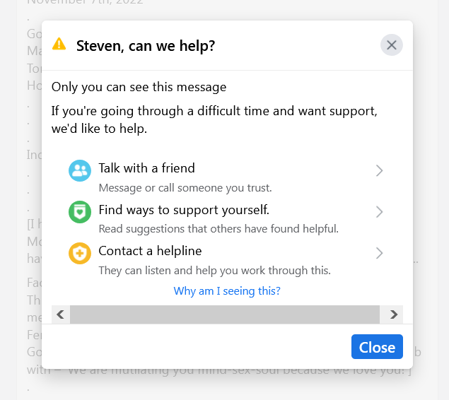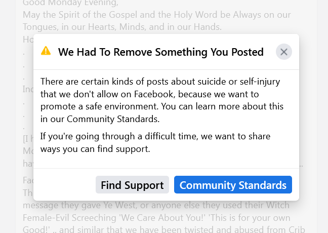 Facebook Immediately Blocked it because of 'Reported 'Self Harm'‘