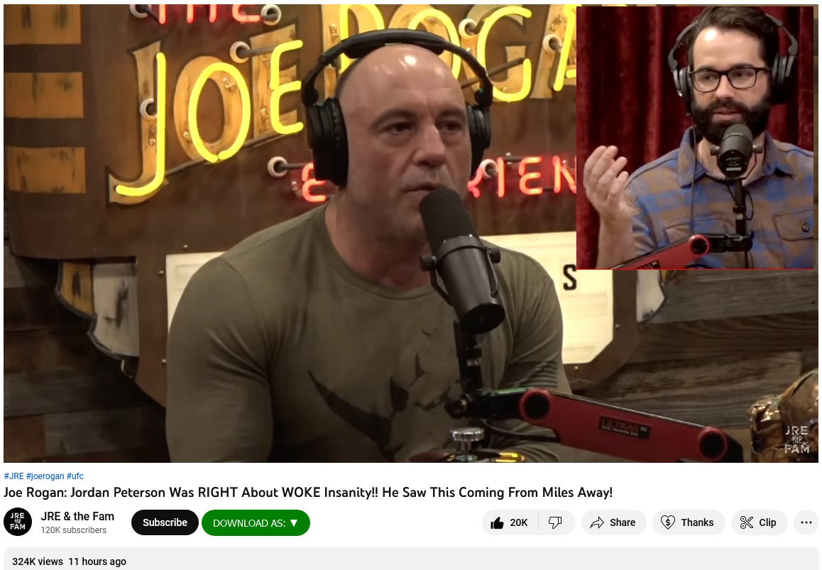 Description of video - 'Joe Rogan & Matt Walsh discuss Jordan Peterson seeing this wave of woke from a mile away when he originally challenged the gender names in colleges. Now they are coming after kids younger and younger to taint their minds and souls before their brains are fully develop in after your mid 20's.'