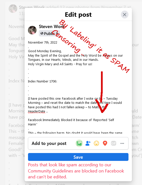 So – this morning before getting up I posted the Facebook version of the Evening post with the URLs of the last 6 Censored days of posts found in SubStack, PDFs in DropBox, and other locations (See PostScript below for the URLs), and included a few of the videos and comments from yesterday as I would for a normal post – and just after I grabbed a PDF print and going back into Facebook to Edit - I was greeted by a note that they are blocking it based of 'self-harm' reasons or some such Female-Evil ..