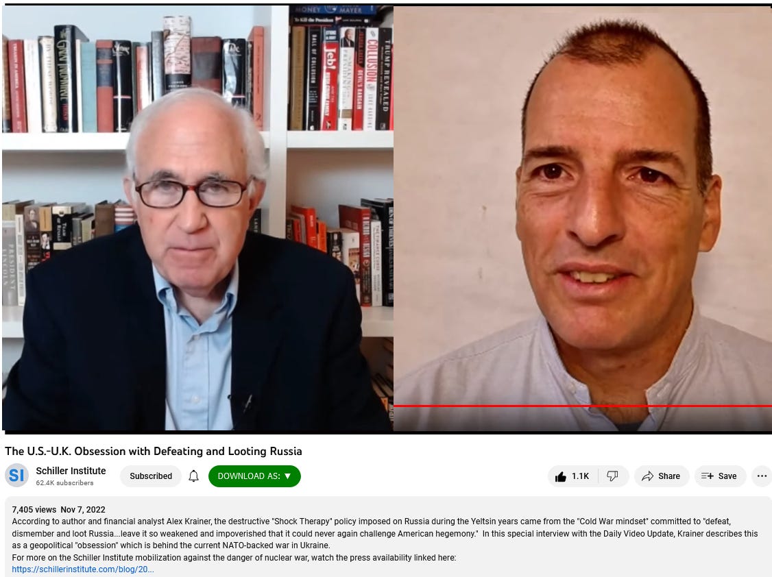 From video description - 'According to author and financial analyst Alex Krainer, the destructive "Shock Therapy" policy imposed on Russia during the Yeltsin years came from the "Cold War mindset" committed to "defeat, dismember and loot Russia...leave it so weakened and impoverished that it could never again challenge American hegemony." In this special interview with the Daily Video Update, Krainer describes this as a geopolitical "obsession" which is behind the current NATO-backed war in Ukraine.'