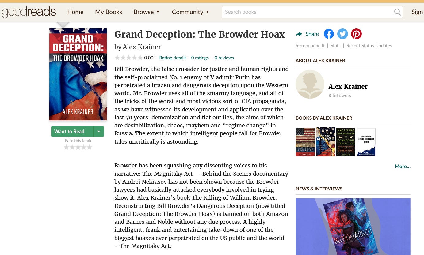 Goodreads page: https://www.dropbox.com/s/biql77f78b75sx1/Grand%20Deception_%20The%20Browder%20Hoax%20by%20Alex%20Krainer.pdf