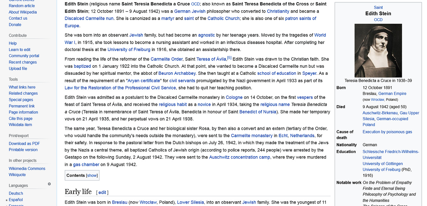 https://en.wikipedia.org/wiki/Edith_Stein (Saint Teresa Benedicta of the Cross)