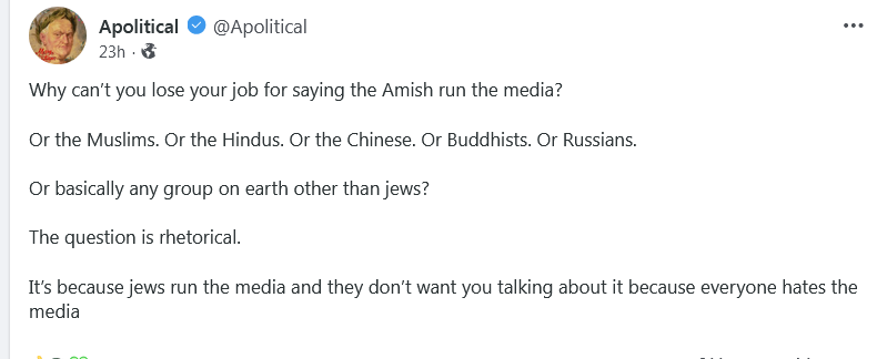 I did spend a bit of time on older topics, fishing around, but basically the biggest 'New' topic was that of the 3 content creators that are blocking my comments two are Jewish and of those two they are clearly interesting and I enjoy there perspectives and interviews, but the push of conflating 'Jews' with religion, tribe (ethnic) and other things which is clearly unclear and slimy on purpose, and I wonder if there actual popularity is artificially larger through YouTube AI promoting – or alternatively the opposite; that many others who likely as good or better who if the Golden-Calf Satan worshipers – the owners and policy brain-F-ers in control of such – are suppressing and how that is like the 'Affirmative Action' (evil-State directed Racism and society destroying) and anti-White-Males and hyper-empowering such cnts and filling with clear provable lies and unreasoned resentment and-or fear.