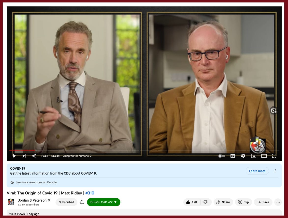 Here is the Prof. Peterson being an excilent interviewer and extracting clarity and shaping the conversation to many key points. If there were not a huge amount of other general information pointing to everyone in power connected to directing the creation of the Plandemic and Shaping the absolute Opposite what any reasonable professional would have done and directed – then the general tone would not be so clearly ridiculous .. thumb-up ass waiting to ask some questions when any reasonable person would have hanged all those people and the older women in families of connected and been hone and breaking bread with family and neighbors Celebrating that evil Witches would not be as much of a Threat for them and their children.