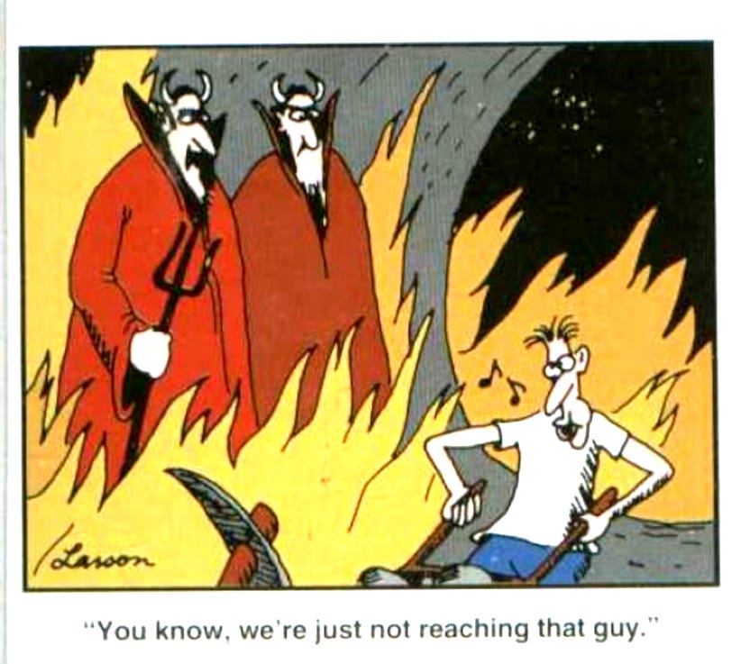 It is very possible that such could have been headed-off at any point through a Virtuous life but the environment .. Reality .. is a reflection of the increasing insanity and anti-rationality Holy Warning of what happens with the rejection of God and His Loving Laws, and accepting any crazy excuse that is handed to us so we can excuse Sin in ourselves and others, and so continue in the Spiral and now seeming Free-Fall .. this is likely the experience Every soul that rejects God and His Love, and embrace Satan and Her Love – the Burned carbon stubbed remains of fingers from the Burning Stove we repeatable forget over and over again .. yet Here We Are Again, with mutilated soul, body, mind, sexuality, retarded intellect to whatever level is needed to Pretend this is not an Torture Oven and we have so little time to turn away from Her until we Burned Again.