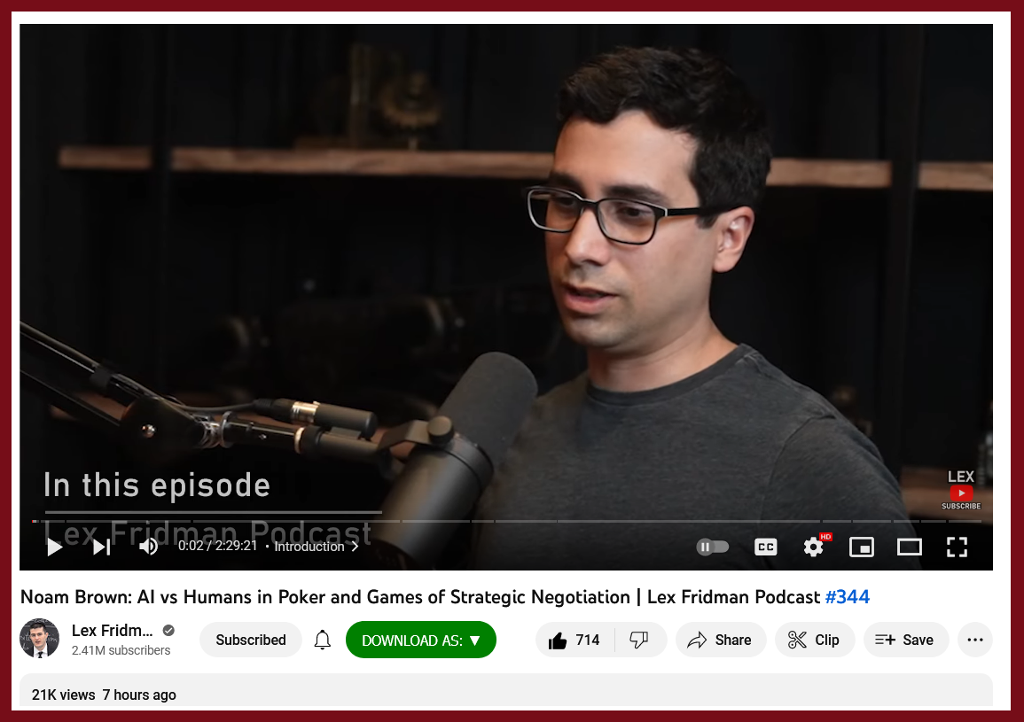 “Noam Brown: AI vs Humans in Poker and Games of Strategic Negotiation | Lex Fridman Podcast #344”