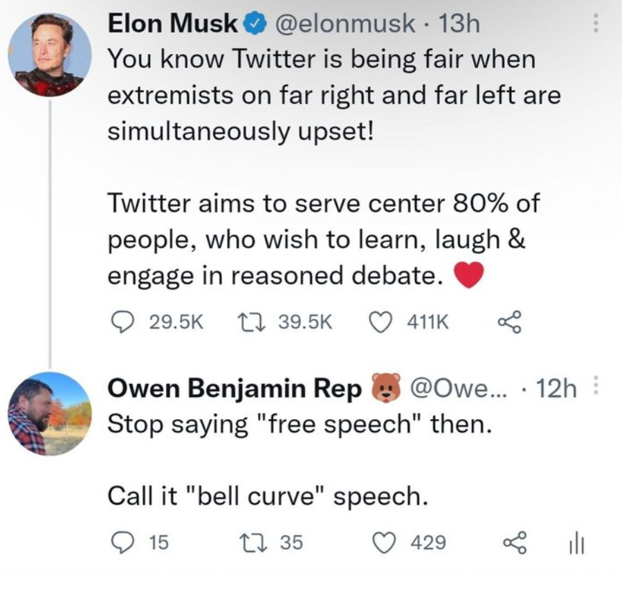 I am glad that in general people are realizing how 'Free Speech' must be more Absolute .. with the Twitter situation. With a sad chuckle it was written that what would be allowed as 'Free Speech' would be only acceptable to the Center 80% of the people ..