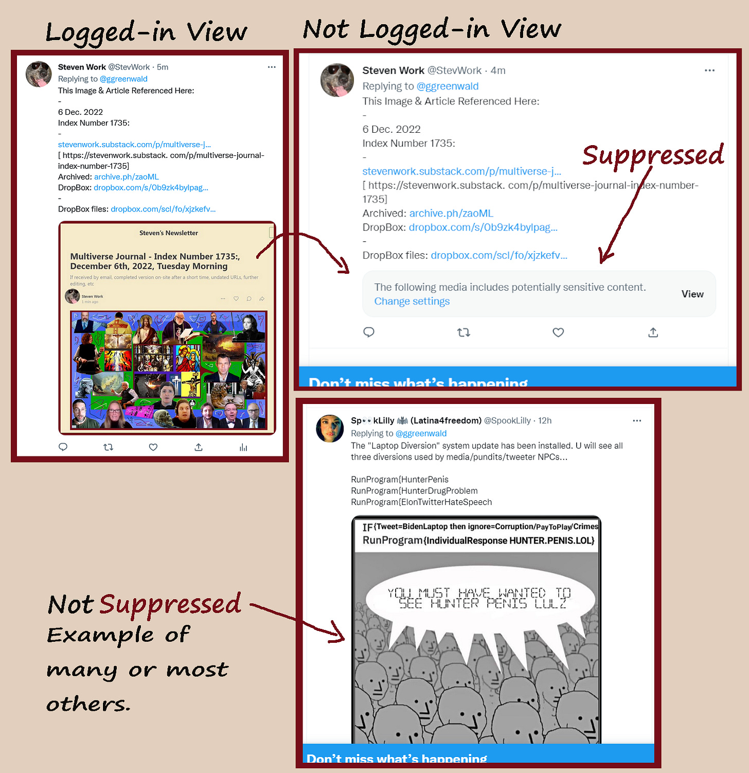 I found that Twitter is suppressing my Tweets. By not logging-in and looking .. searching for .. my tweet as a response to others' Tweet I am always put in the 'Sensitive' section where someone must read the warning and then get to see them with all the others that are being suppressed like I am for who I am, or with the ones using bad language and such .. and my image (usually the SubStack first page reduced) is also not shown – again with a 'sensitive' warning.