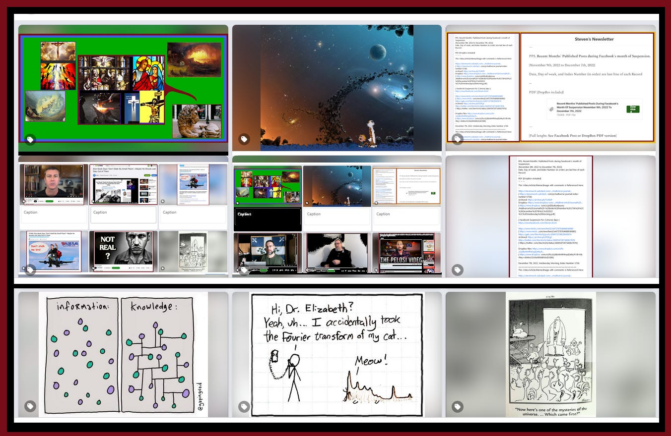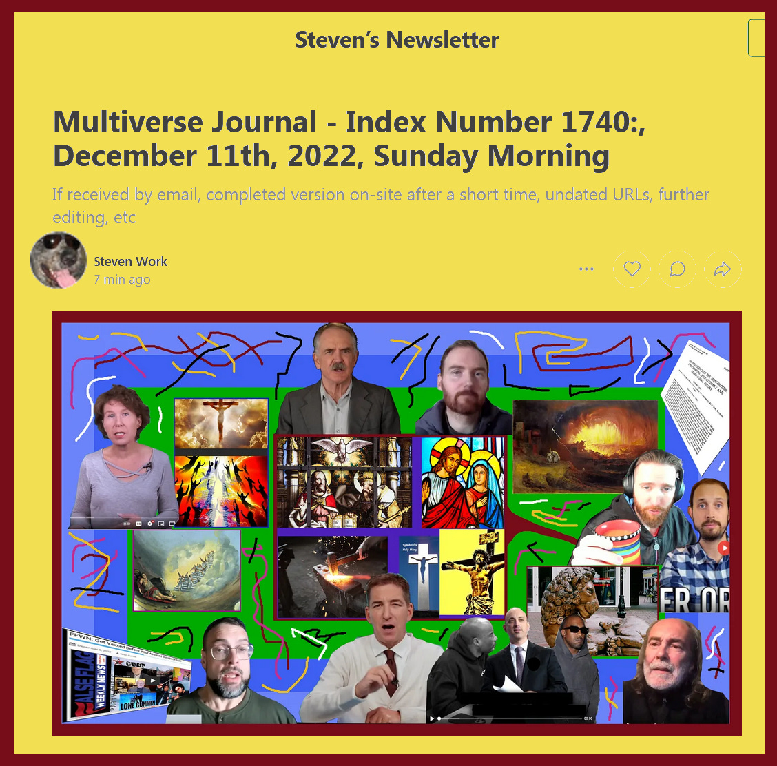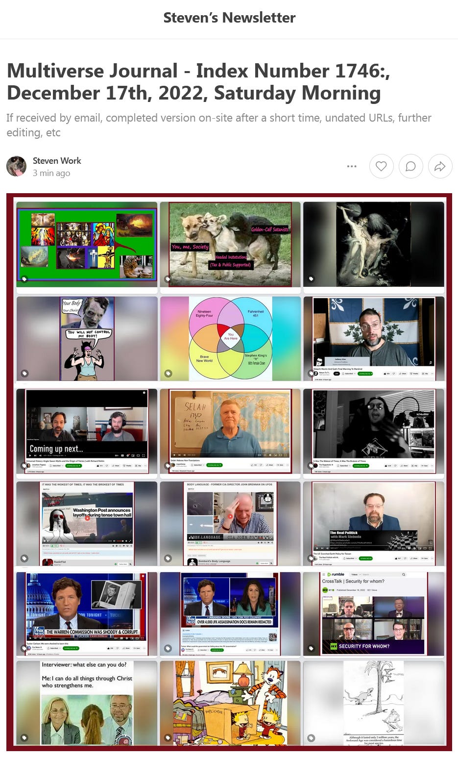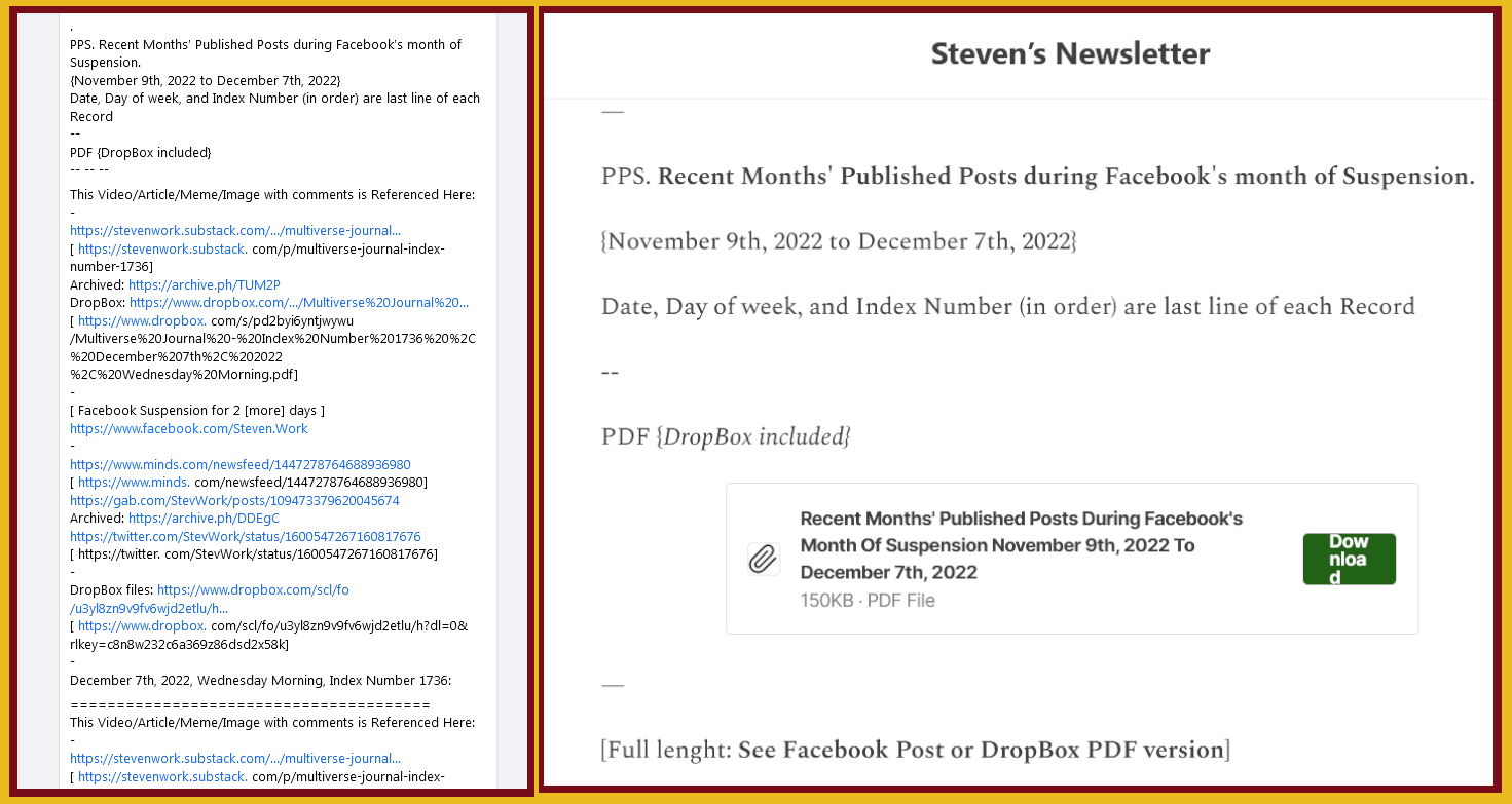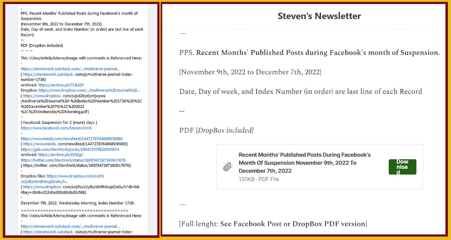 And somewhere along these I considered those that only had access to Facebook and not SubStack or Minds and how that recent contrived 30 day suspension removed a huge amount of my writing from the flow being documented – and for those in which DropBox exists and not SubStack and also which Facebook actively removes and Censors posts the Satanic Witch-Queen does not want you to read (versions of you) that posting to Facebook where I included a list of all the Posts and the DropBox PDFs for those SubStack posts they missed in Facebook Post (only in the Facebook Version in PostPostScript, 'December 11th, 2022, Sunday Morning, Index Number 1740:' ( click, or See PostScript for URL)