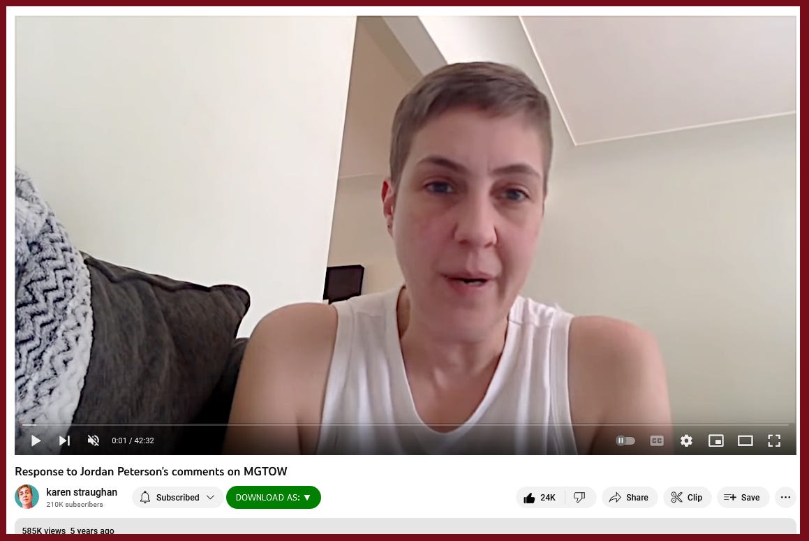 .. I have yet to hear Peterson – or anyone [besides Karen the little she has managed – like this – God Bless her!] talking about the kind of targeted vileness that the male-hating inHuman cnts did to me and is pretty common, .. mostly unknown because that level of gaslighting coordinated evil usually ends in death, jail, or work-place shooting and suicide for the target man.