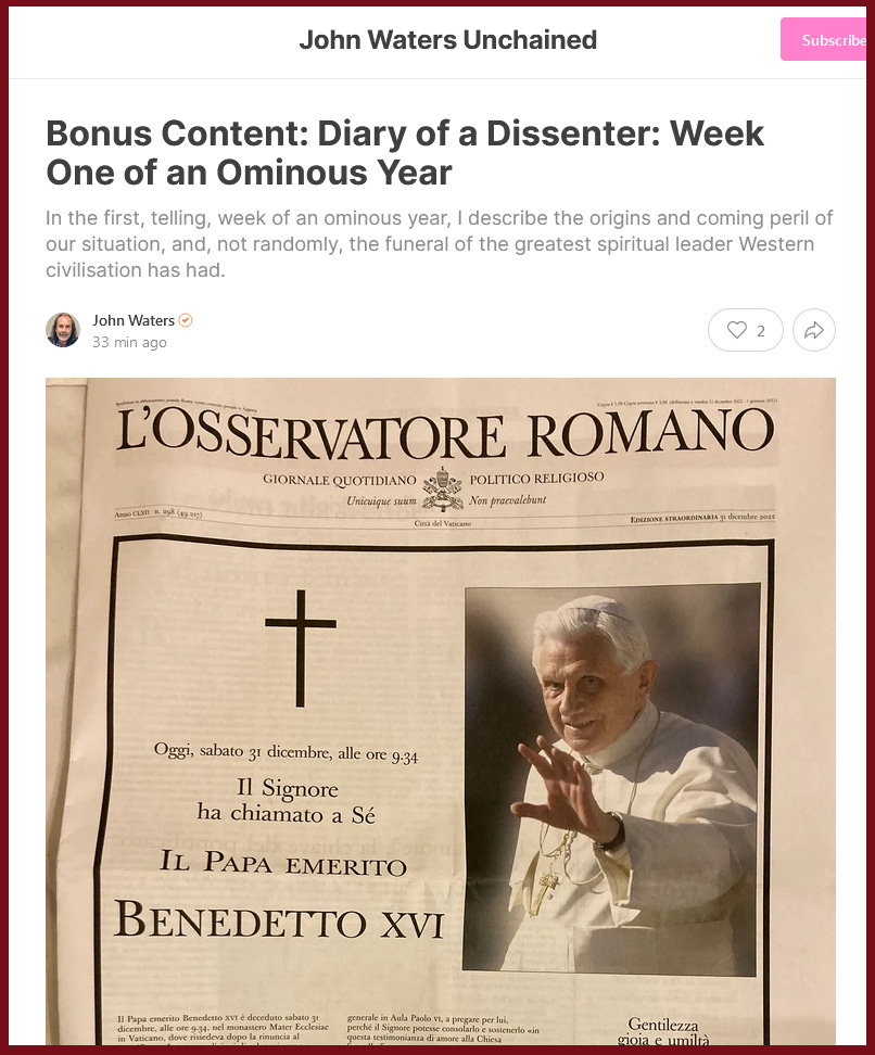 .. Article - 'In the first, telling, week of an ominous year, I describe the origins and coming peril of our situation, and, not randomly, the funeral of the greatest spiritual leader Western civilisation has had.'