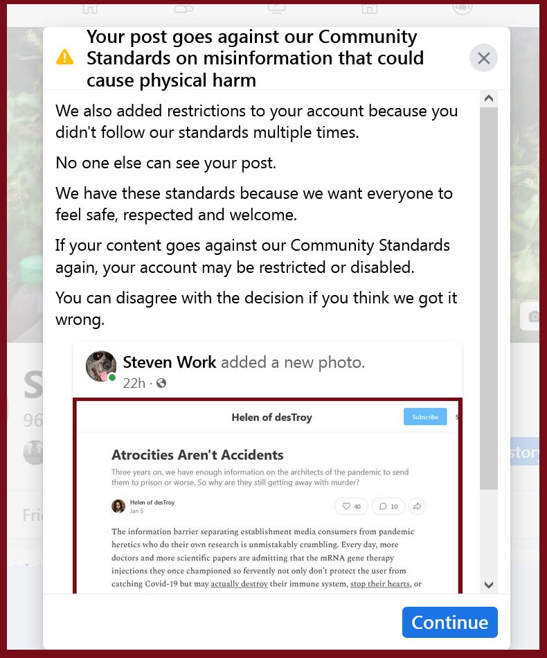 My Facebook Suspension [again] based on something I would never consider a problem unless I was actively brain-F-ed enough to go around to self worried every sentence if the AI Demon at Facebook would be okay with this. It was an Image containing the verbiage within an article that linking too should not have caused a problem – unless it was being secretly flagged (for which I consider a possibility, raising the 'trigger' on meme ambiguity, because their Female-Evil slimy ways – such as never finishing and 'locking-up' when text of post contain a link to some of the sites I sometime link too, and no warning why so .. so if someone is evil enough to link to those then best waste as much of there time by not telling them and forcing them to struggle and perhaps give-up and never write about such evil again .. thinking.