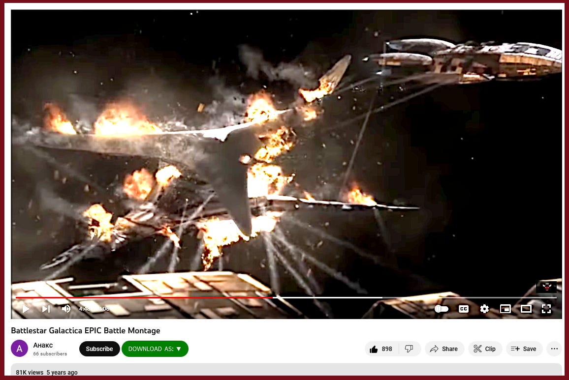 This battle montage video was pieced together (and music added) from the series 'BattleStar Galactica' (and I like watching and listen to it at 1.5 speed.)