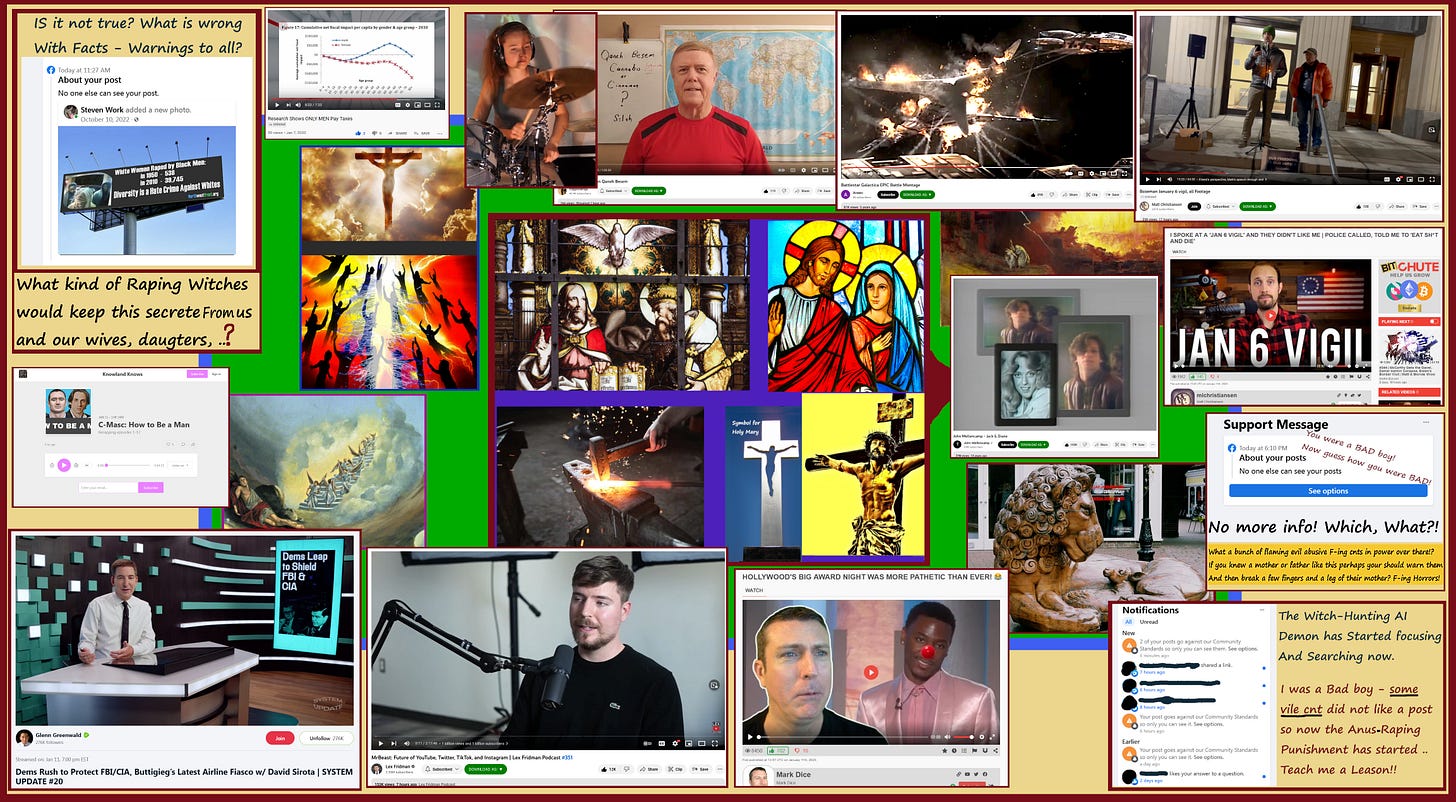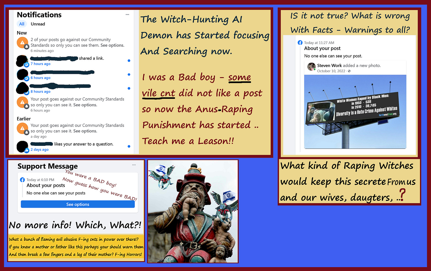 ( .. exclusive for SubStack because the Vagina-god Satanic Witch owners and directors of Facebook are Mind-Raping horrors that Hate us and want us suffering endlessly and Burning in Hell - They Lying, Censoring, manipulating and benefiting from our life-long and generational Suffering from lies and ignorance they Profit from. Mind-controlling slimy lying Hate-filled Female-Evil vile horrors that are a Curse on Life, Love, Joy, Peace, Liberty, Rationality, .. and our souls. — May these Profit us by helping see and consider some of what the Satanic minions of the Witch-Matriarchal ruling families want to hide from us.)