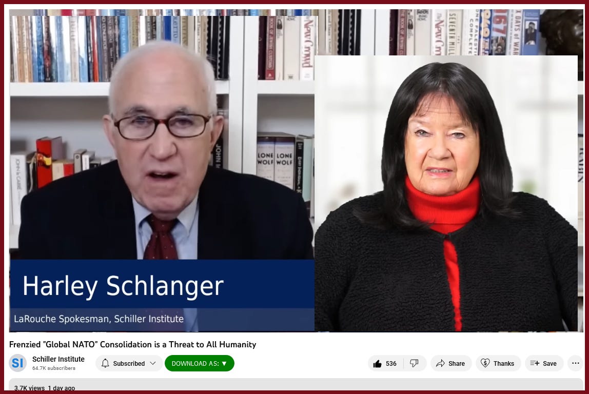 'The all-out mobilization underway this week to consolidate the forces of Global NATO, to continue the war against Russia in Ukraine, and to target China, was the subject of this week's conversation with Helga Zepp-LaRouche. The "Ukraine Contact Group" meeting on Friday at Ramstein Air Base in Germany will likely see an increase in pressure on Germany to send more offensive weapons to Ukraine. Even as the War Hawks behind Global NATO are projecting the war will continue into 2024, or until Putin is removed, there is a battle plan to try to prevent Chinese development aid in Latin America, she said, citing a presentation last July by the head of the U.S. Southern Command, and an article from Army War College associate Evan Ellis, calling for the U.S. to counter the desire for development in South America.'