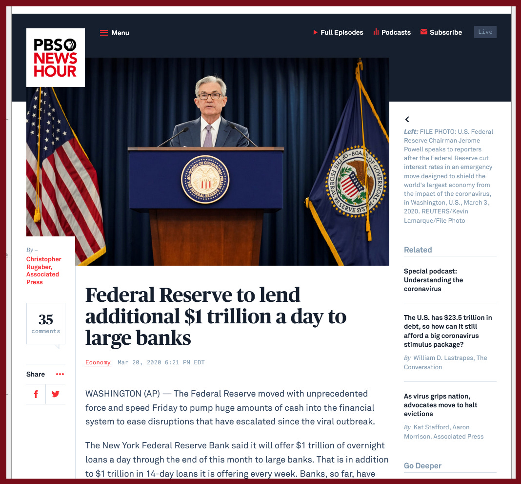 “Federal Reserve to lend additional $1 trillion a day to large banks”