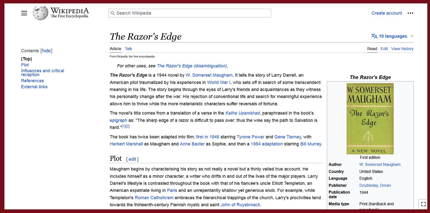 A little while ago I linked the book The Razor's Edge here in a post,
