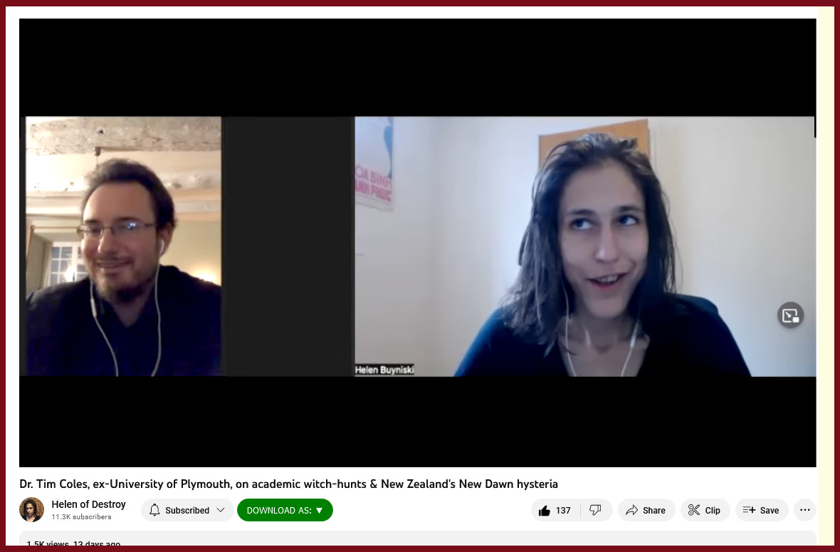 “Dr. Tim Coles, ex-University of Plymouth, on academic witch-hunts & New Zealand's New Dawn hysteria”