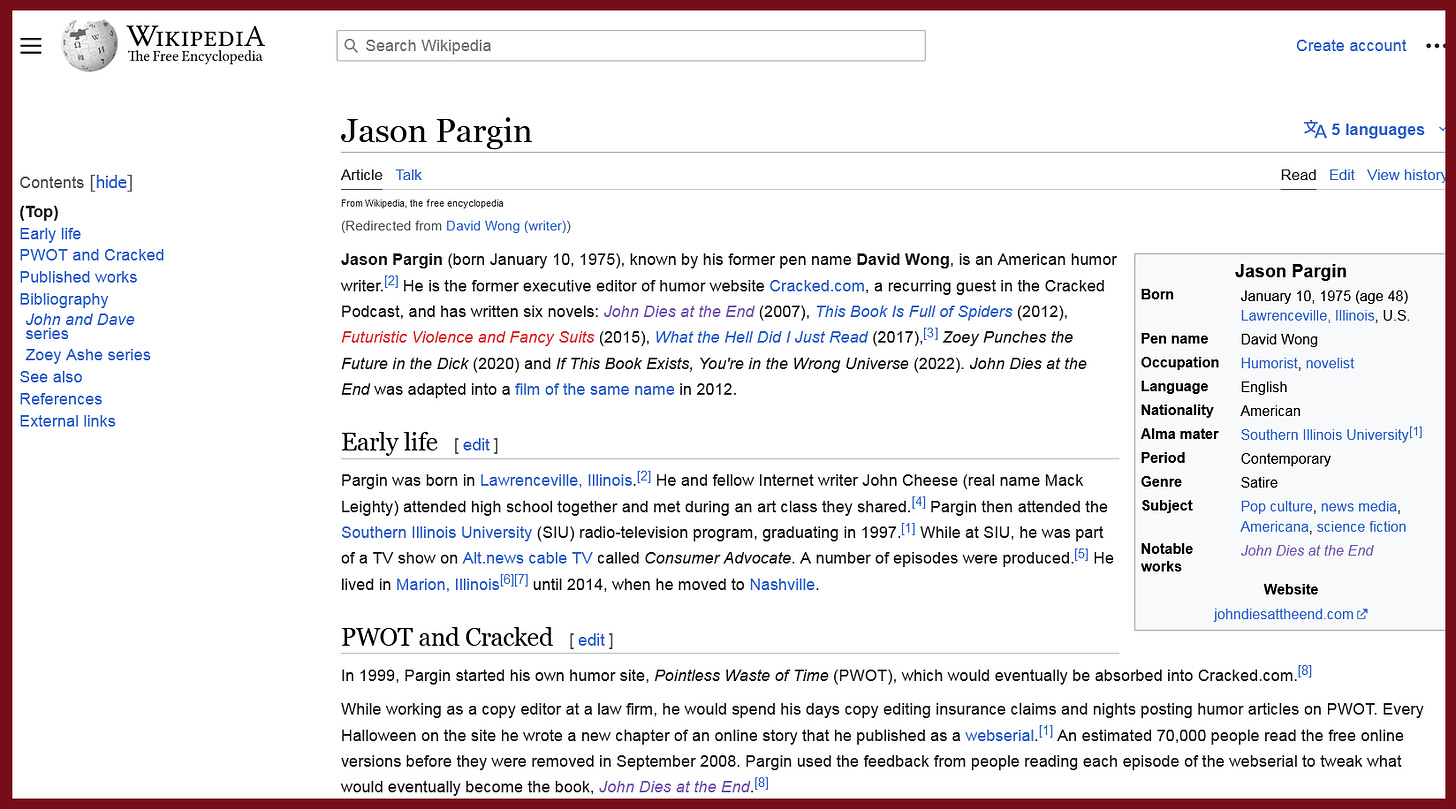 https://en.wikipedia.org/wiki/Jason_Pargin (David Wong)
