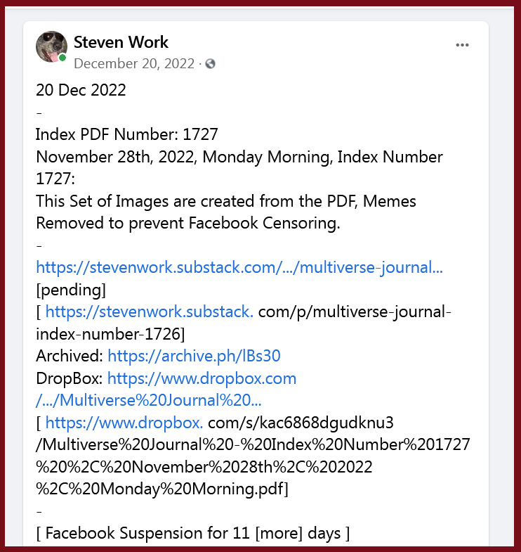 PDFs of the latest that have been collected (of many more) Facebook Censored Posts – listed by Index Number, in DropBox directory here, ..
