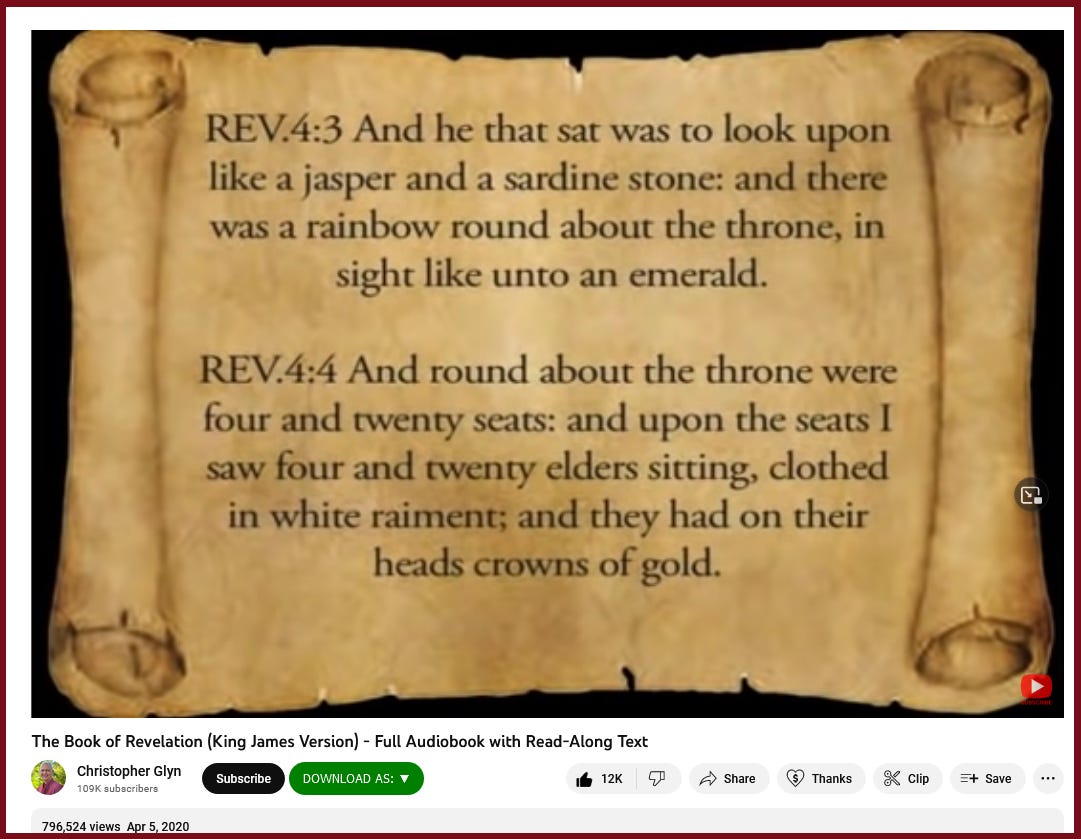 For reference – here is a decent video with the Book of Apocalypse [Revelation] by Saint John., ..