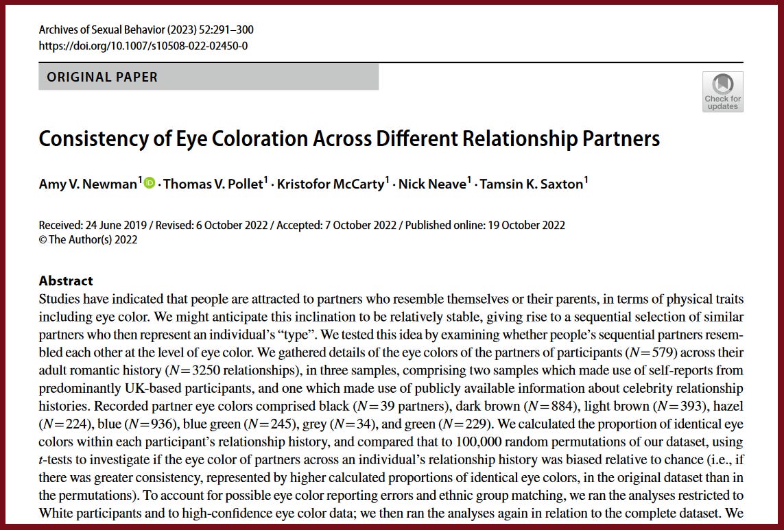Newman, A.V., Pollet, T.V., McCarty, K. et al. Consistency of Eye Coloration Across Different Relationship Partners. Arch Sex Behav 52, 291–300 (2023). https://doi.org/10.1007/s10508-022-02450-0