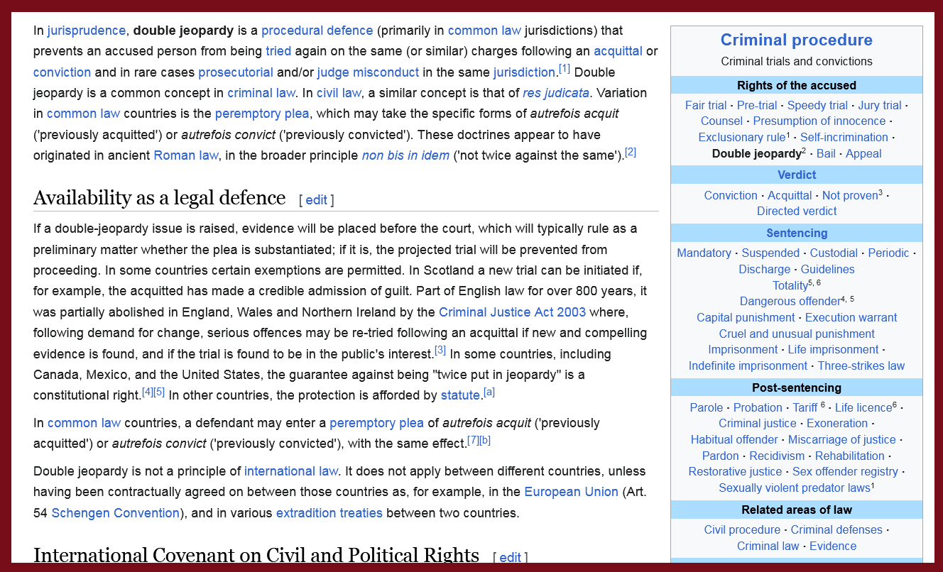 Double jeopardy (archived) is regularly happening these days – I have recently seen it twice within a short period of time .. when bitter cnts who failed to get Bill Cosby to divorce wife and marry them and got into lines to do drugs and sex with him when young .. then when the consensual drug-use and sex was mentioned in trial the jury refused to convict – so the putrid Female-Evil controlled State called 'ReDue!!!' ..., {more after video link} ..