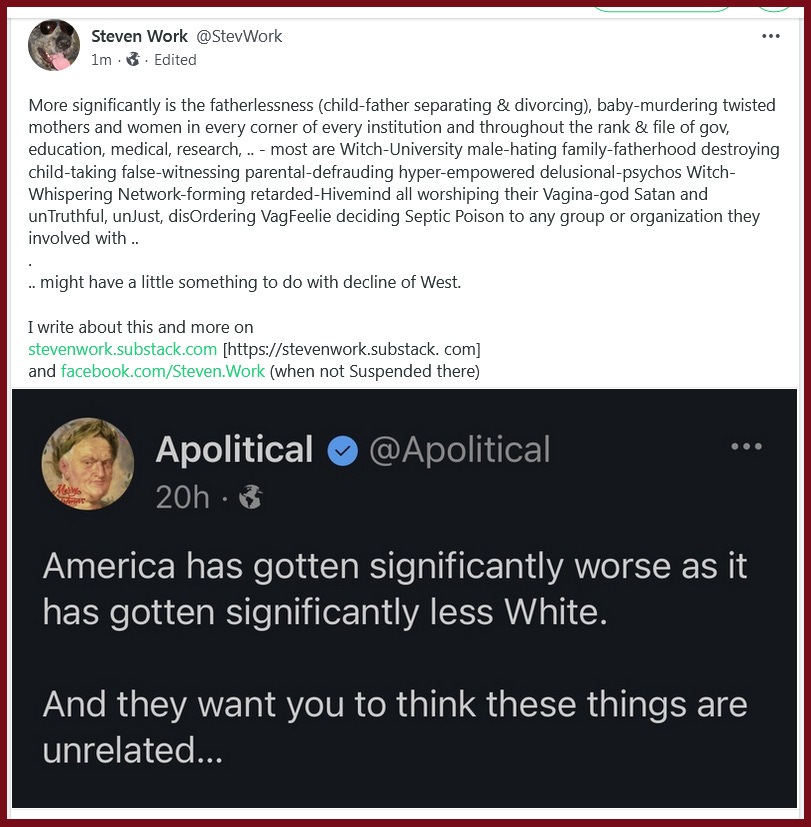 ( .. exclusive for SubStack because the Vagina-god Satanic Witch owners and directors of Facebook are Mind-Raping horrors that Hate us and want us suffering endlessly and Burning in Hell - They Lying, Censoring, manipulating and benefiting from our life-long and generational Suffering from lies and ignorance they Profit from. Mind-controlling slimy lying Hate-filled Female-Evil vile horrors that are a Curse on Life, Love, Joy, Peace, Liberty, Rationality, .. and our souls. — May these Profit us by helping see and consider some of what the Satanic minions of the Witch-Matriarchal ruling families want to hide from us.)
