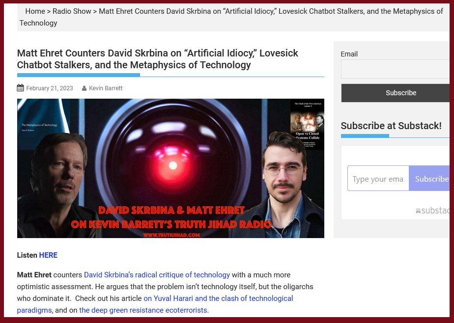 “Matt Ehret Counters David Skrbina on “Artificial Idiocy,” Lovesick Chatbot Stalkers, and the Metaphysics of Technology”