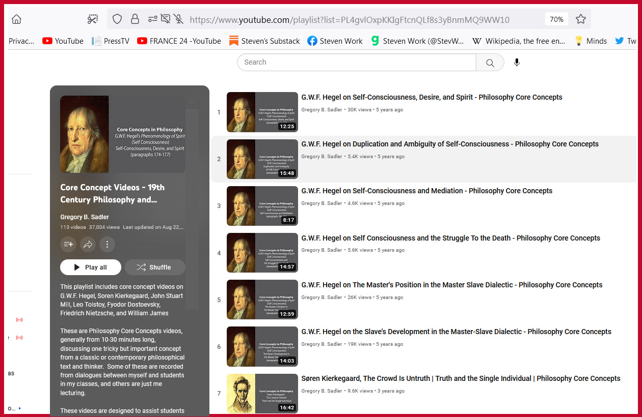 .. YouTube PlayList containing Hegel and many other Philosopher's outlines and detail videos.