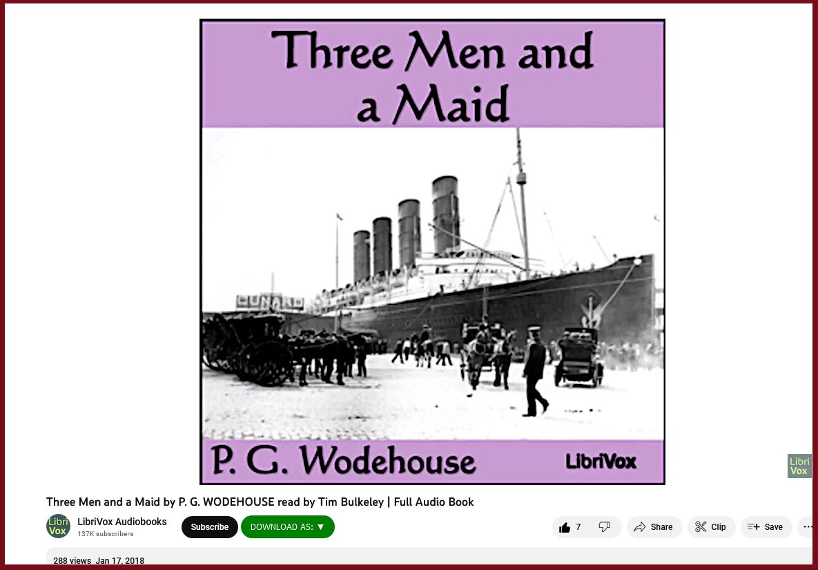 It happened again .. I was looking around in YouTube Search for some brain-eating space-alien story - ideally raising a kitten named Fuzzy, perhaps .. and while looking for such I put this Public Domain story 'Three Men and a Maid' (archived) by P. G. Wodehouse (archived) playing .. and then after in a short time decided I liked it – but expect to be disjointed in the aspects of Space Aliens or even kittens.