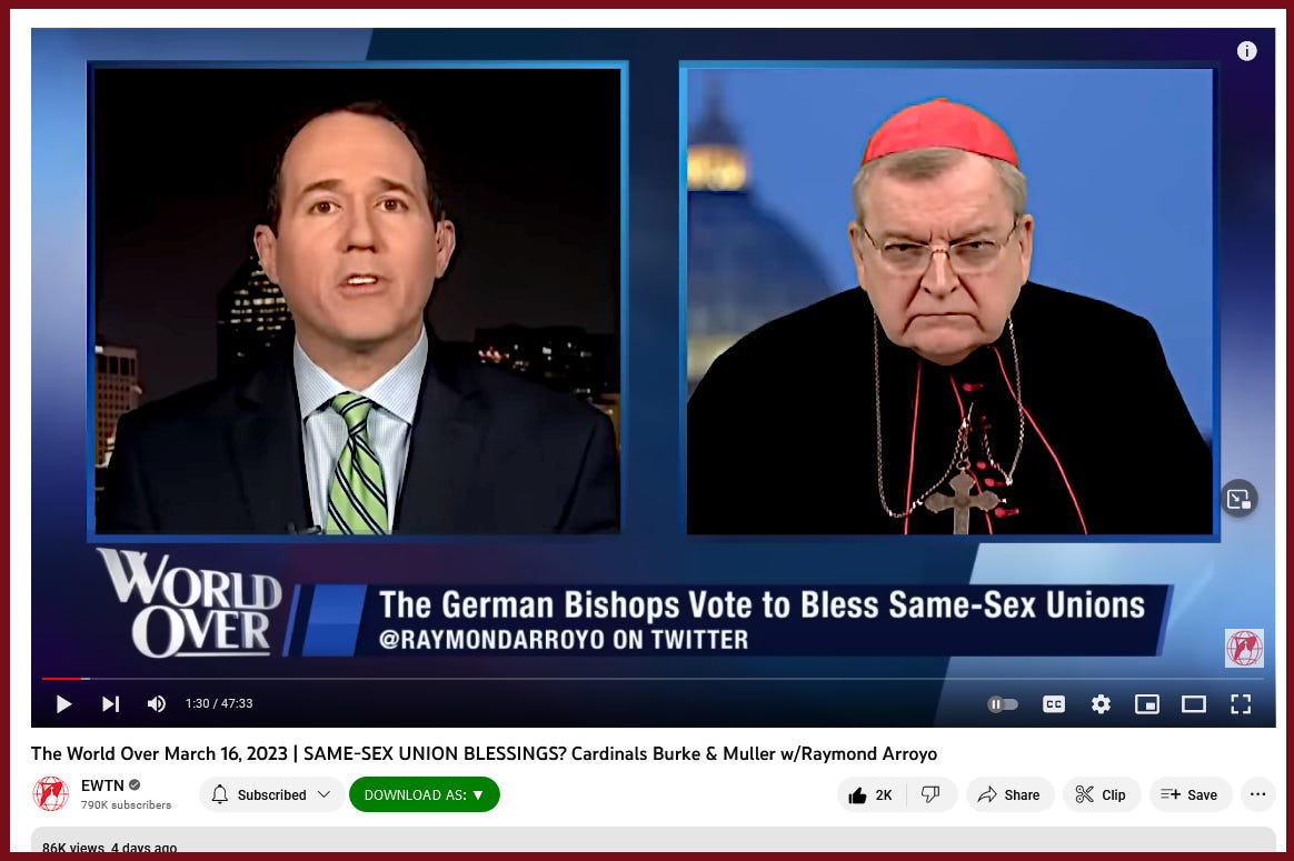 “The World Over March 16, 2023 | SAME-SEX UNION BLESSINGS? Cardinals Burke & Muller w/Raymond Arroyo”