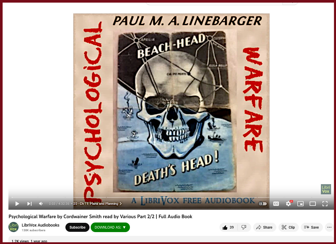 I enjoyed this short story and looked for more author's work Cordwainer Smith (archived) and found in Public Domain the following after two videos which is a work (under his real name Paul Myron Anthony Linebarger) on Psychological Warfare, something we should learn to recognized.