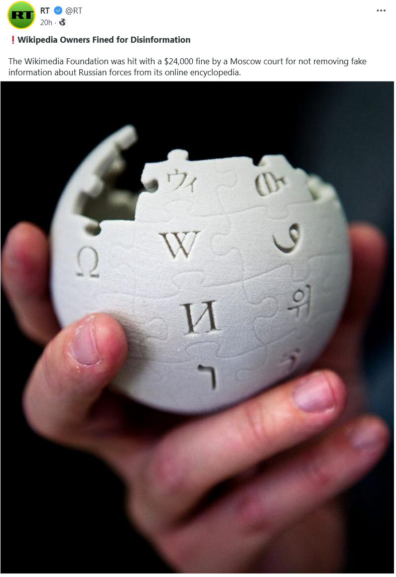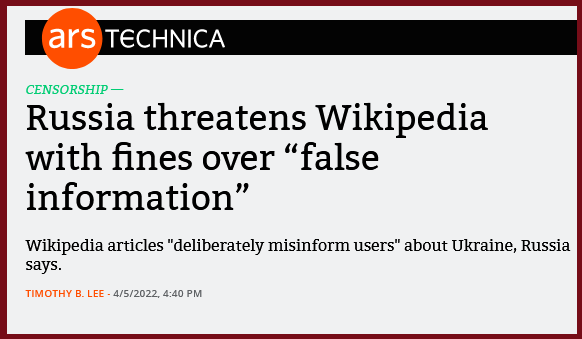 .. Article - 'Wikipedia articles "deliberately misinform users" about Ukraine, Russia says.'