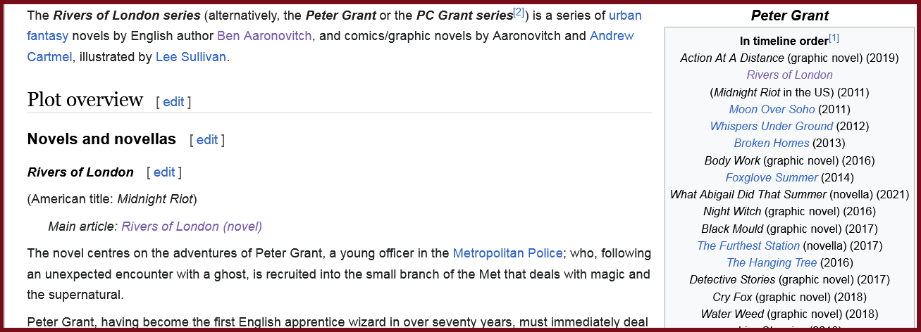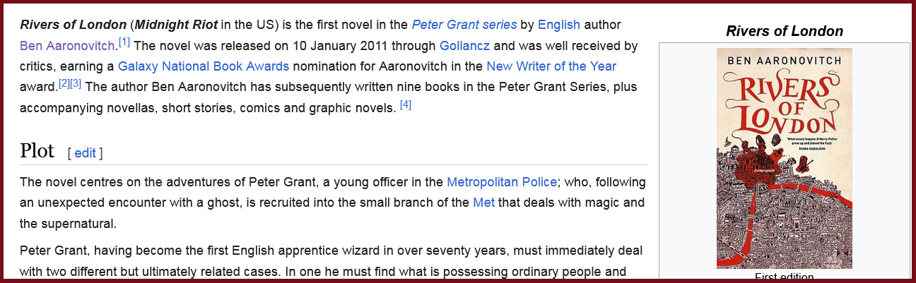 I have been reading (audio-book listening too) a new series that is pretty enjoyable ('Rivers of London' book series archived by Ben Aaronovitch archived) The first book (archived)