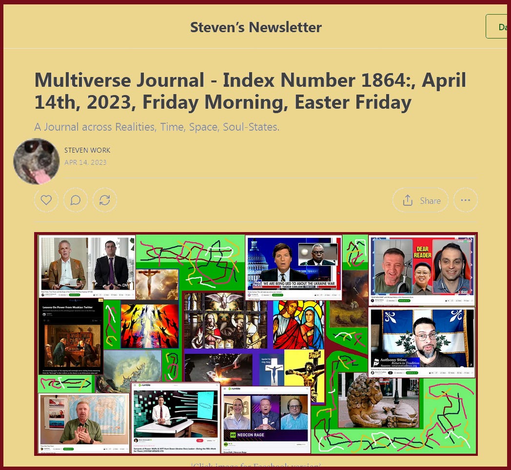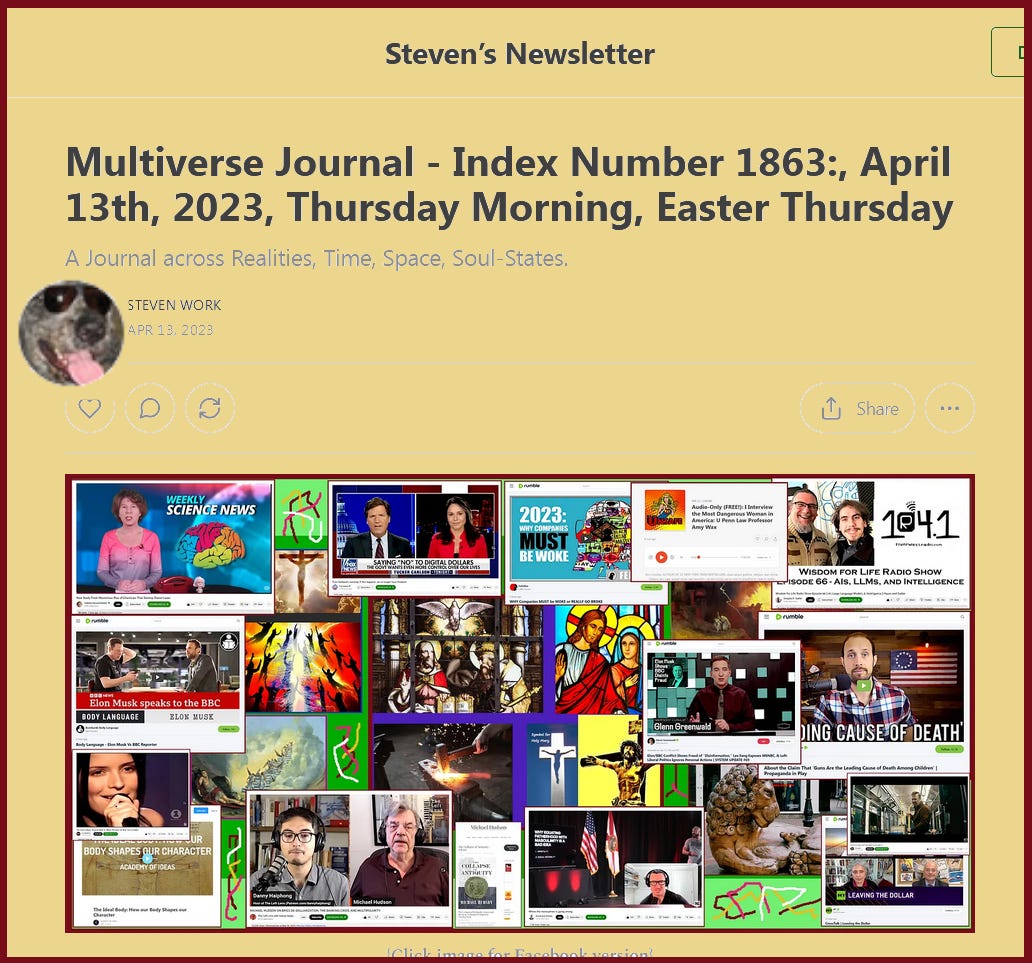 That addition is an extension of recent Post, Multiverse Journal - Index Number 1863:, April 13th, 2023, Thursday Morning, Easter Thursday archived, Facebook ver. archived, Chick of see PS for full URLs.